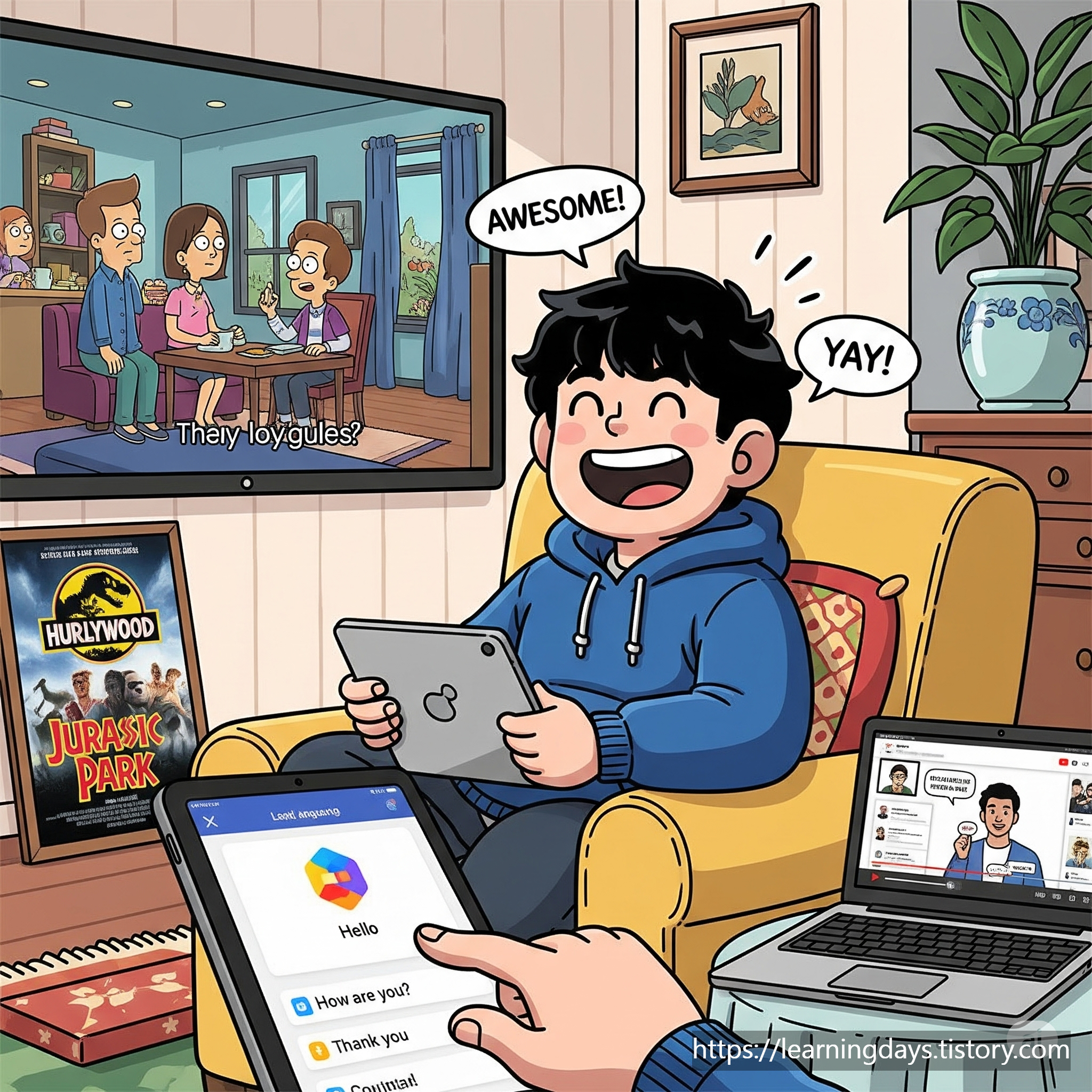 미드, 유튜브, 앱은 그저 시간 때우기가 아니라 자연스럽고 효과적인 영어 노출 도구가 될 수 있어요.
