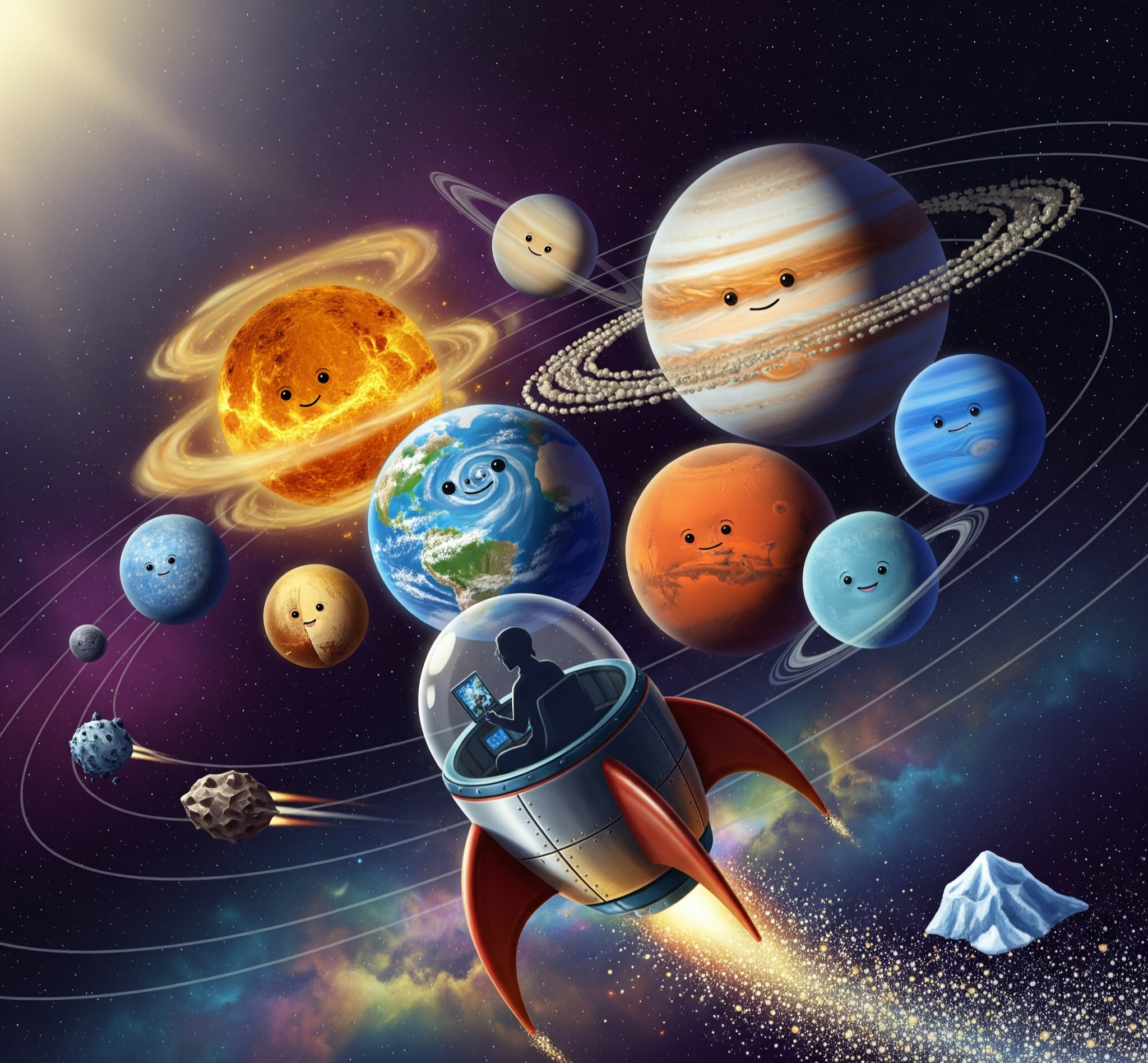 태양계란 태양을 중심으로 돌고 있는 행성, 위성, 소행성, 혜성 등이 모여 있는 가족 같은 공간이에요.
