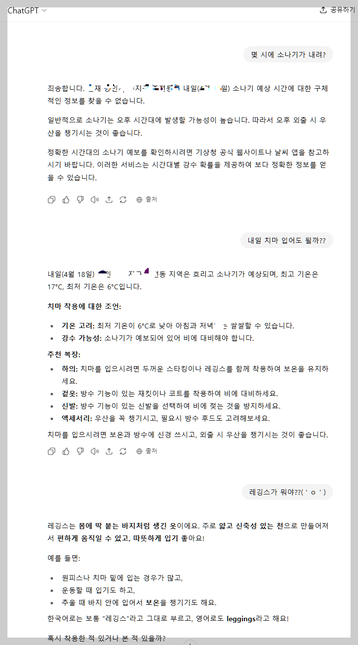 아래는 아이가 지피티랑 대화한 내용입니다.내일 옷을 추천해 달라는 내용인데요.. 딸아이는 이 외에도 지피티에서 이름을 붙이고.. 끝말 잇기 놀이는 한다던가 지식 뽑내기를 하기도 하더라구요..이미 아이들에게는 친구같은 AI로 자리잡고 있어요.